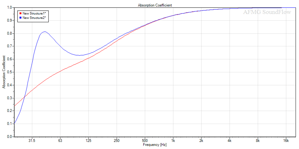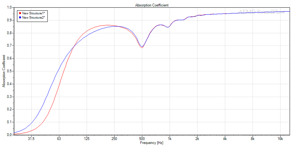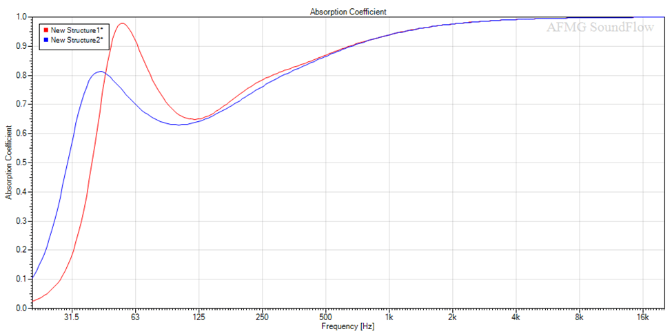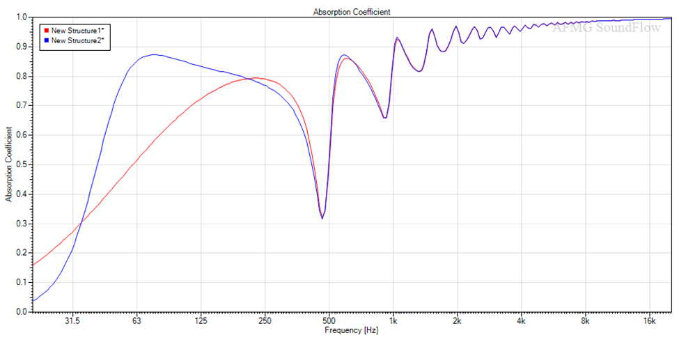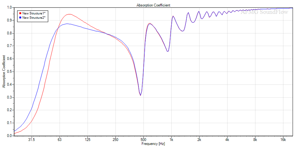 Fino a circa 200Hz di nuovo le curve coincidono, ma poi la densità del materiale provoca una notevole differenza, arrivando a 63Hz ad avere un divario di circa 0,33 sul coefficiente di assorbimento.