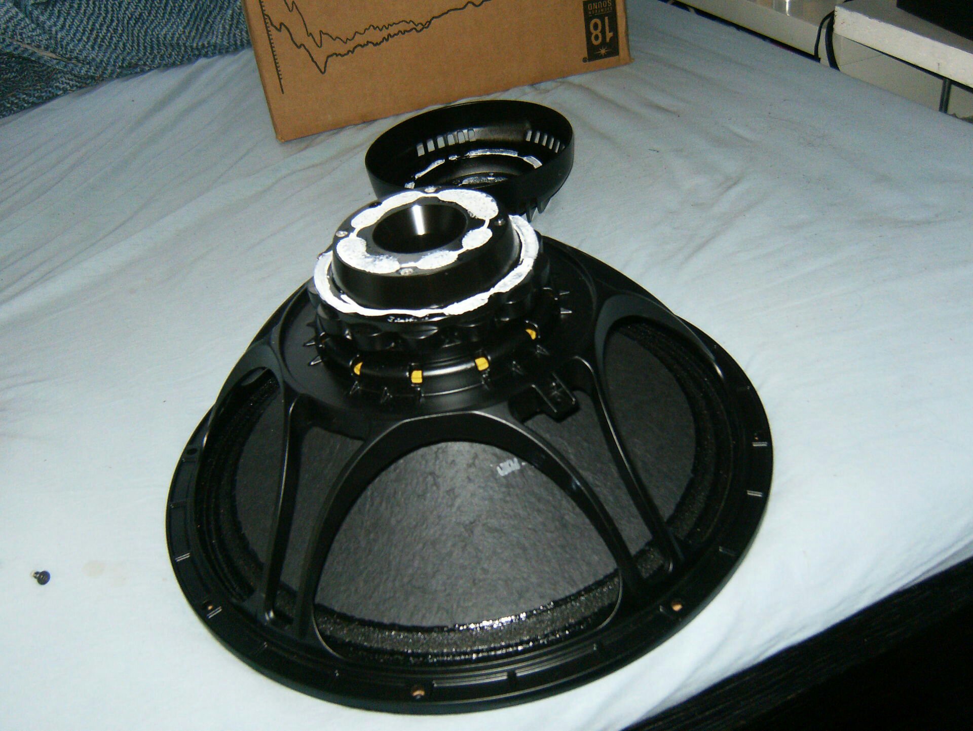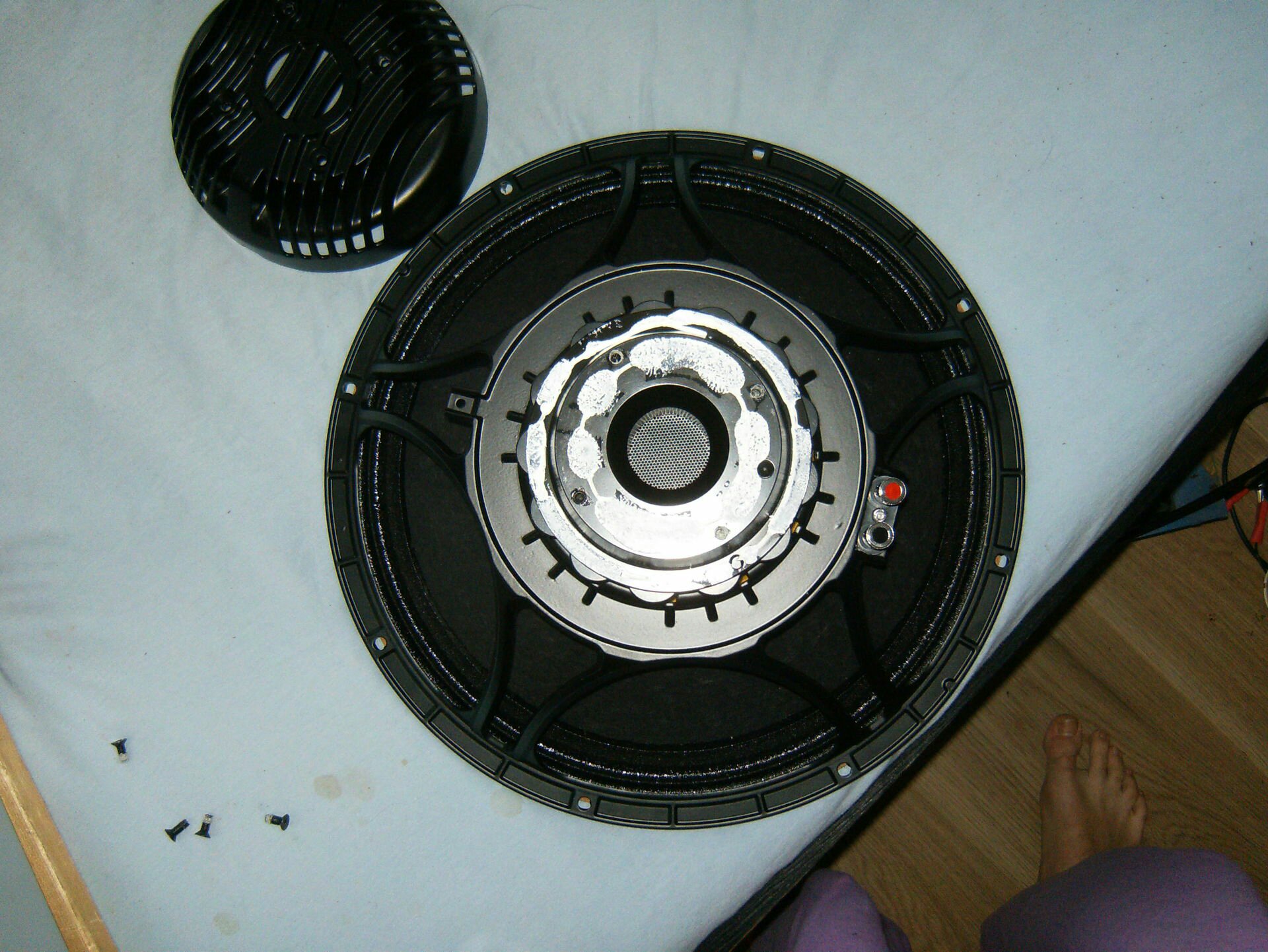 Devo dire che al di là dell’affare questo Woofer mi ha subito soddisfatto anche per la costruzione; il complesso magnetico non è un unico blocco di neodimio interno alla bobina, rinchiuso dentro una calotta di lamiera, ma una serie di pasticche dello stesso materiale disposte intorno alla bobina stessa, che trasmettono il calore generato ad una sorta di dissipatore posteriore a sua volta solidale con il cestello. Una costruzione molto simile ai complessi magnetici dei più rinomati componenti Focal Hi-End; inoltre i “raggi” del cestello sono molto più sottili dello standard ed in numero doppio, evidentemente per ottenere la minore contropressione possibile durante i movimenti e per un maggiore controllo delle riflessioni genereate dal cestello stesso.