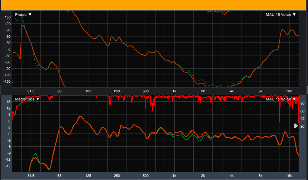 Ecco la risposta dei 2 diffusori, in giallo la ART 715-A MK4 e in verde la mia; quello che si nota è un leggero buco a12.5KHz del mio driver ND840 che rispecchia pienamente il foglio delle specifiche e una leggera prevalenza della mia a 65Hz che sinceramente non mi aspettavo visto il QT molto basso del 15ND930, oppure l’ RCF ha un passa alto un po’ più aggressivo del mio che è impostato a 35Hz.
