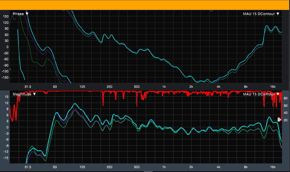 Infine gli ultimi 2 preset, BOOST in blue e D-CONTOUR in celeste (“copiato” da Yamaha); BOOST usa un PEQ con Q 1.41 a 58Hz ( la frequenza di accordo = poca escursione) +4dB con filtro passa alto spostato a 40Hz di tipo Butterworth 18dB/Oct, mentre D-CONTOUR usa un filtro Low Shelving a 300Hz con Q 0.5 +4dB, High Shelving a 8000Hz con Q 0.7 +4dB sull’ingresso e un passa alto a 40Hz di tipo Butterworth a 24dB/Oct per proteggere ulteriormente da eccessive escursioni vista l’enfasi diffusa su tutta la gamma bassa.