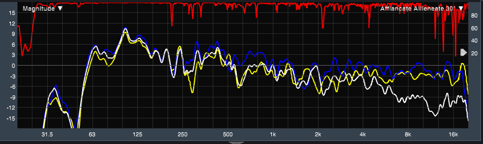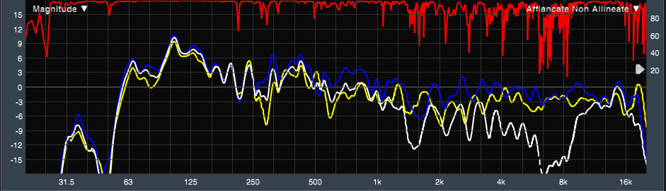 Praticamente problemi su tutto lo spettro di frequenze, inoltre si evidenzia un buco pesante a 73Hz che intacca anche le basse frequenze limitrofe: ad orecchio uno strazio; anche il grafico della “coerenza”, la traccia rossa in alto, è molto irregolare.